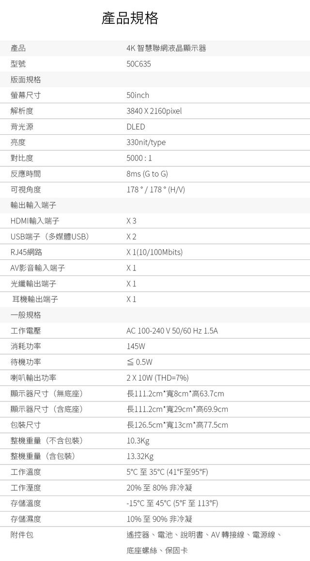 | 其他功能 | Chromecast一鍵投放, 支援HDR, 智慧聯網功能, 語音功能遙控器, 遠端語音控制 |