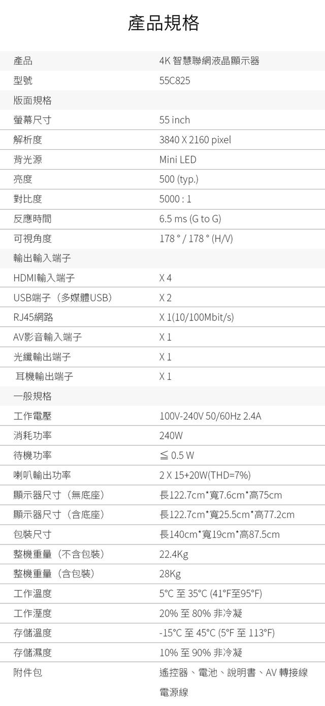 | 其他功能 | 支援HDR, 智慧聯網功能, 遠端語音控制, 語音功能遙控器, Chromecast一鍵投放 |