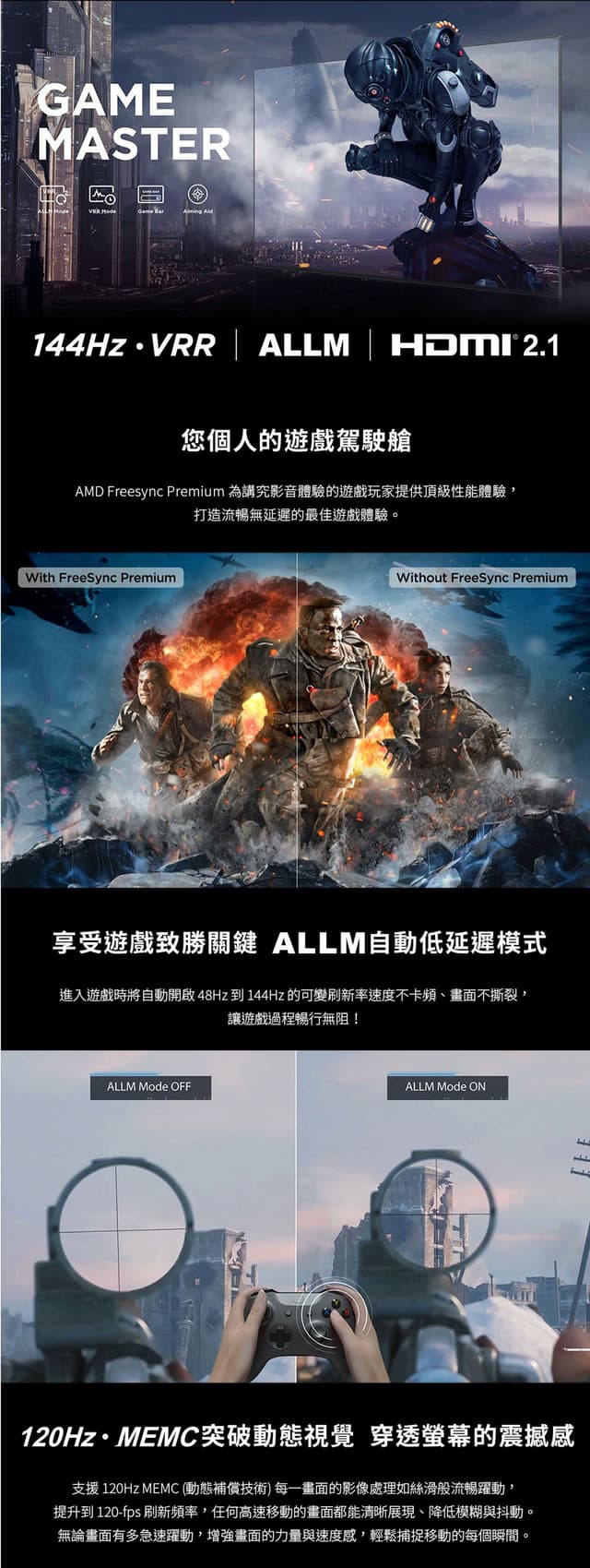 遊戲大師支援144Hz VRR/WIFI 6/HDMI2.1/ALLM,打造個人遊戲艙