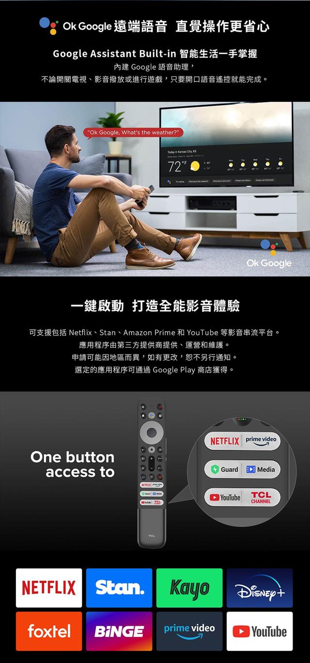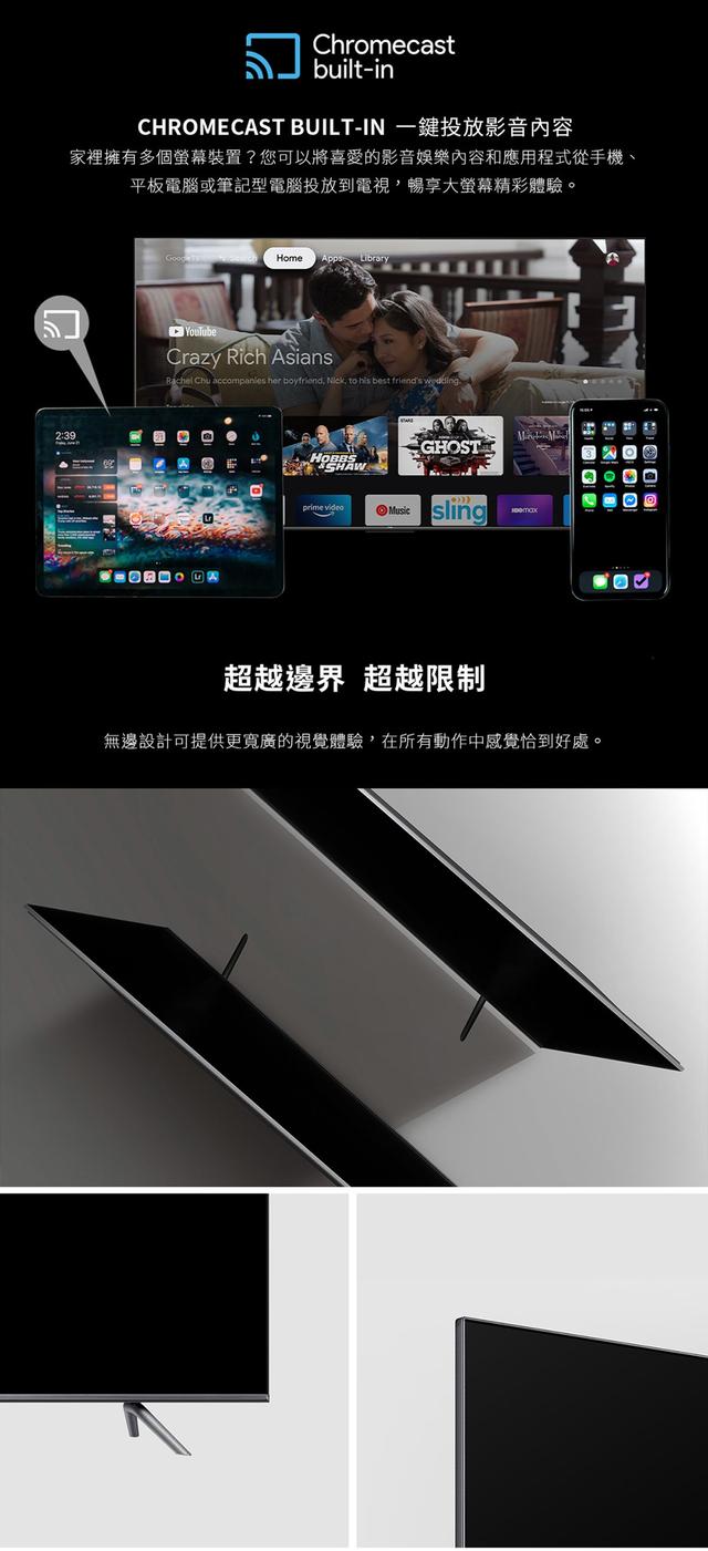 | 其他功能 | 支援HDR, Chromecast一鍵投放, 智慧聯網功能, 遠端語音控制, 語音功能遙控器 |