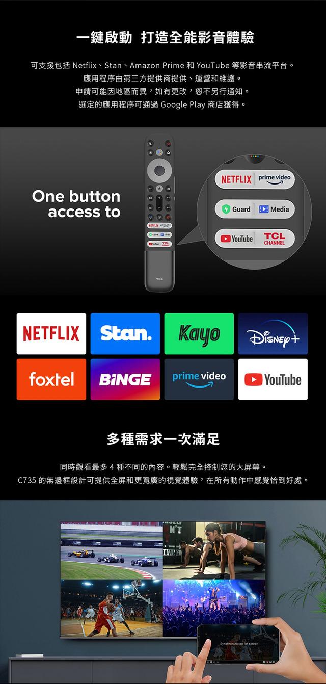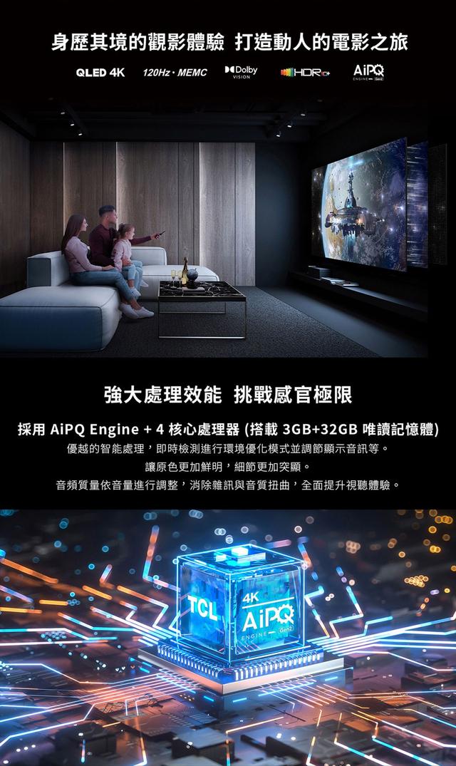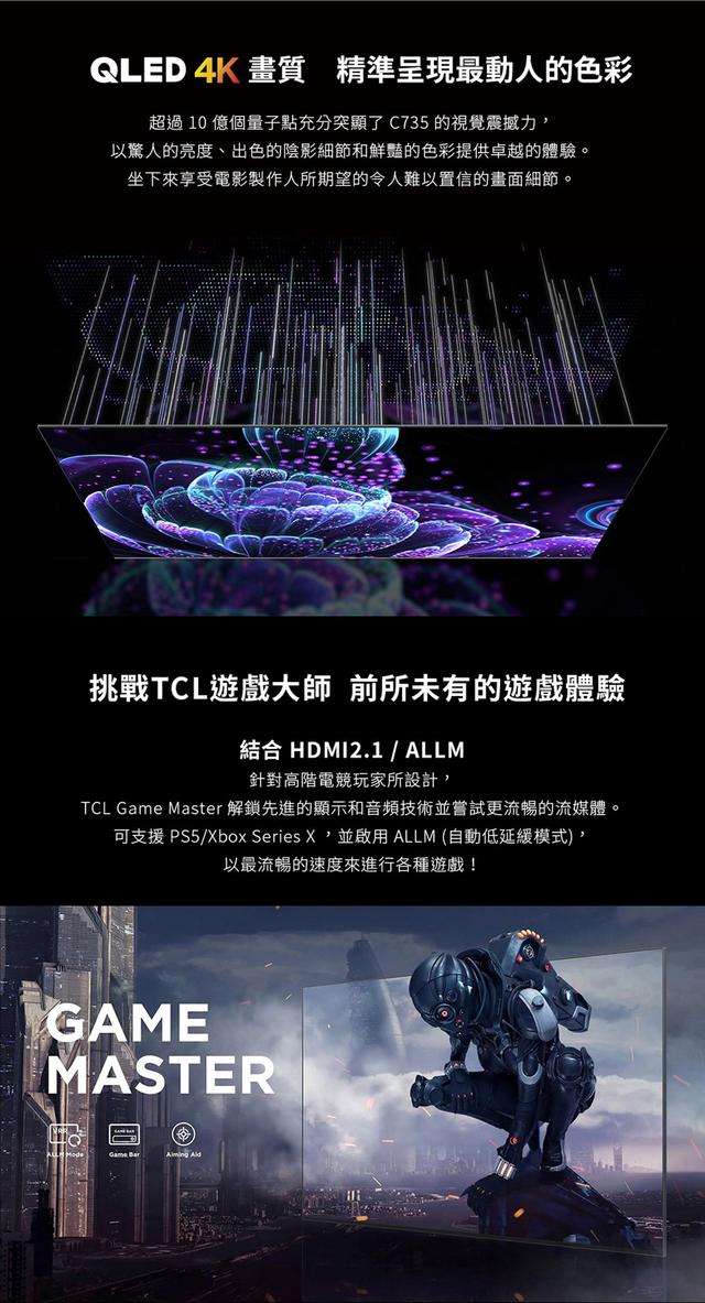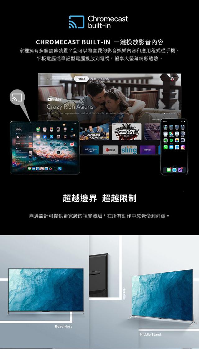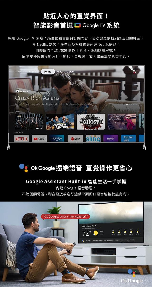 | 其他功能 | Chromecast一鍵投放, 支援HDR, 智慧聯網功能, 遠端語音控制, 語音功能遙控器, 支援AirPlay2, FreeSync |