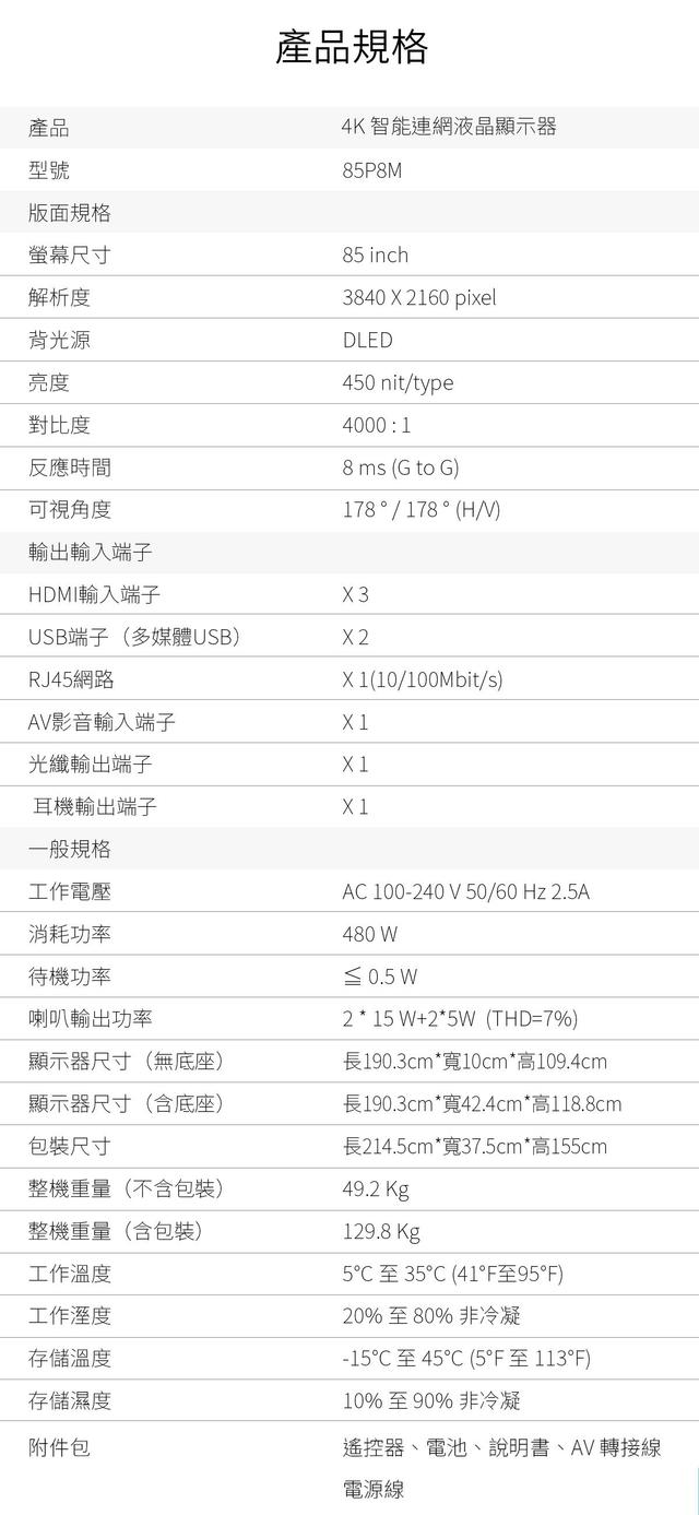 | 其他功能 | 智慧聯網功能, 語音功能遙控器, 支援HDR |