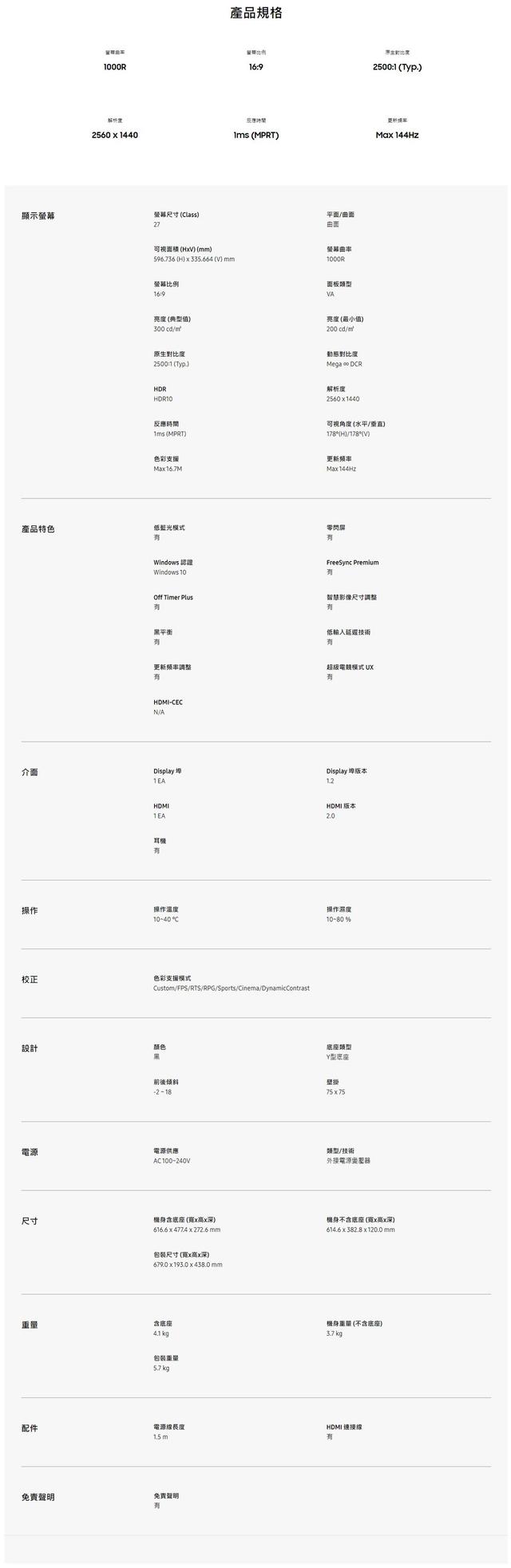 | 特殊功能 | 曲面, 低藍光, 零閃屏 |