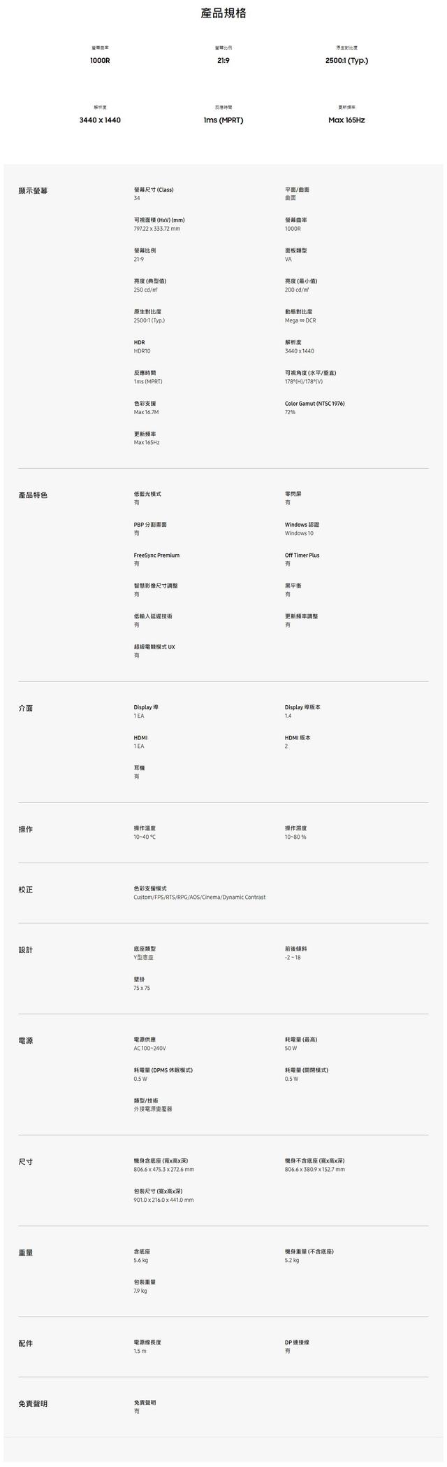 | 特殊功能 | 曲面, 低藍光, 零閃屏 |