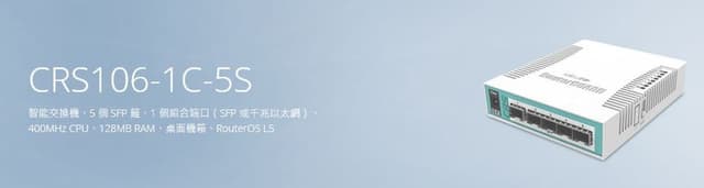Cloud Router Switch 106-1C-5S 是一款桌面大小的智能交換機,配備一個千兆以太網/SFP 組合端口和五個 1.25Gbps SFP 籠。該包裝包括一個電源。它由 400MHz CPU 和 128MB RAM 供電,運行具有 L5 許可證的 RouterOS,並支持 11-30V 電源。