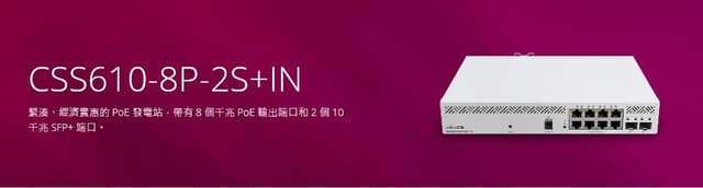 MikroTik CSS610-8P-2S+IN 是一款輕巧桌面型智慧PoE交換器,內建8埠Gigabit RJ45埠全面支援802.3af/at PoE+,每埠最高30W輸出,總供電功率高達140W,可同時供電無線AP、IP電話、監控攝影機。