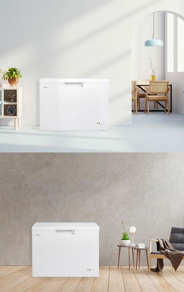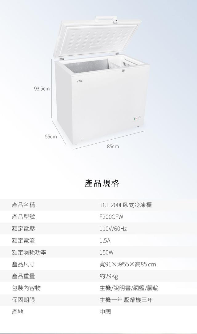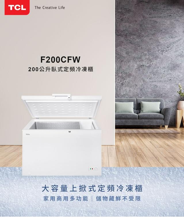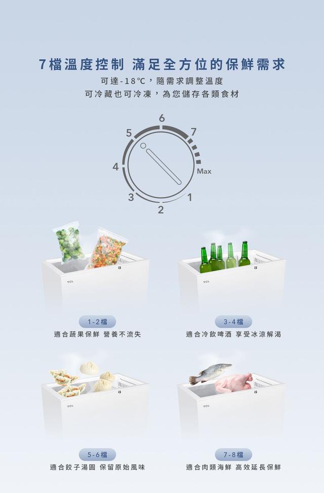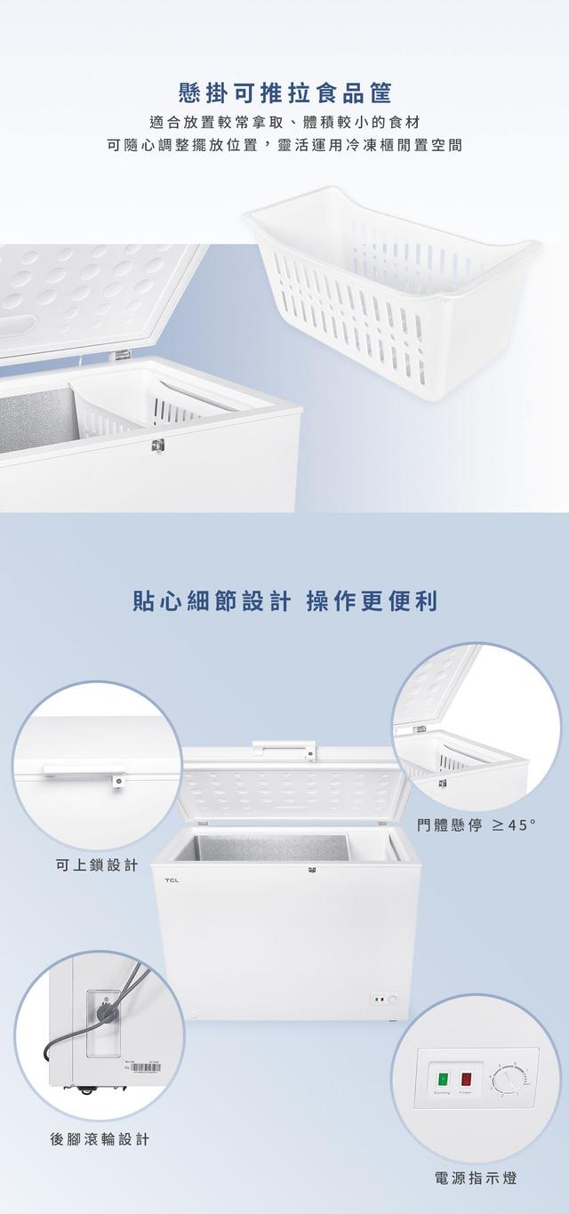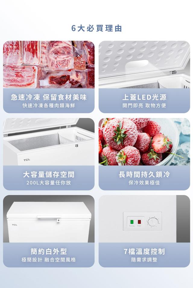 大容量上掀式冷凍櫃200L大容量儲存空間上蓋LED光源,開門即亮7檔溫度隨需求調整懸掛可推拉食品筐後腳滾輪設計,方便移動