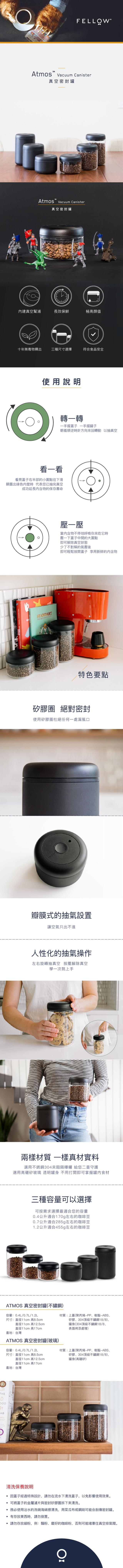 購買須知品名:ATMOS 真空密封罐(不鏽鋼)容量: 0.4/0.7/1.2材質: 上蓋(聚丙烯-PP、樹脂-ABS、矽膠、304頂級不鏽鋼18/8)、罐身(304頂級不鏽鋼18/8、表面烤漆處理)產地:台灣