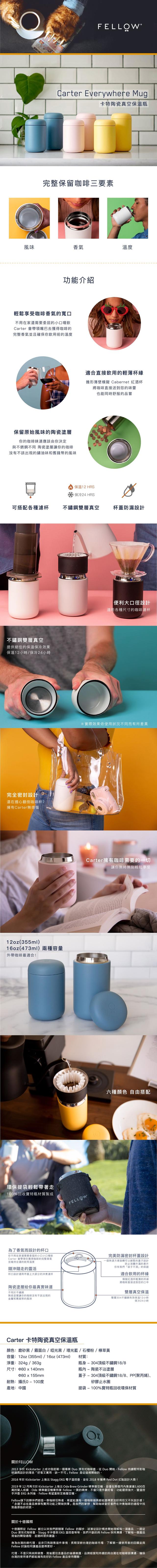 購買須知品名:FELLOW Carter 卡特咖啡真空保溫瓶顏色:磨砂黑 / 霧面白 / 清水灰材質:瓶身:304頂級不鏽鋼18/8瓶內:陶瓷不沾塗層蓋子:304頂級不鏽鋼18/8、PP(聚丙烯)、矽膠止水圈可耐溫度:0-100度有效期限:7年