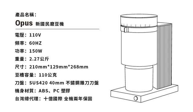 Opus 新國民磨豆機能符合營業級義式咖啡機的研磨要求,無論是 SOE 單一產區濃縮咖啡或一般濃縮咖啡都能輕鬆達成,最佳化的刀盤得以兼容義式及精品手沖咖啡,風味不容許妥協的空間。