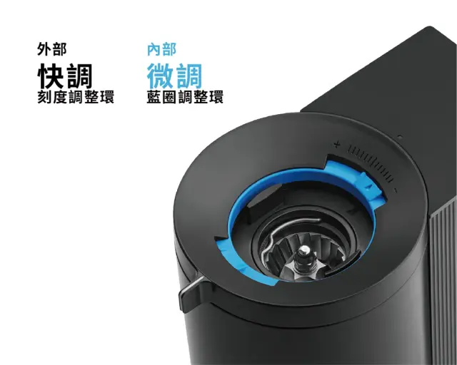 41 段刻度調整環,正負 6 段精細義式調整內環,具有精準段落的定位點,每組大刻度之間仍有三個細調空間,製作義式濃縮咖啡時能快速找到接近的理想流速,再透過微調內環做出合適流速的義式萃取。