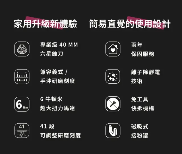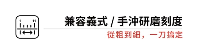 ★ 義式研磨:高扭力馬達、精細刻度調整空間、極細研磨能力以符合 9bar 義式濃縮萃取的粗細度
