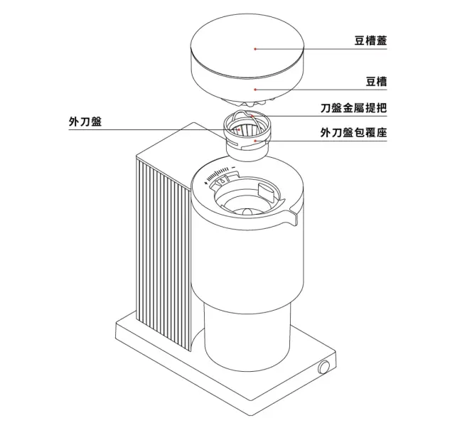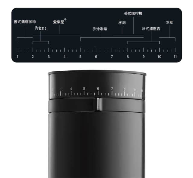 ※您可以在豆槽蓋的背面看到研磨刻度建議區間,比如說:義式刻度建議 1 號到 2 號刻度之間、手沖刻度建議 5 號到 9 號之間,不用擔心不知道粗細如何選擇。