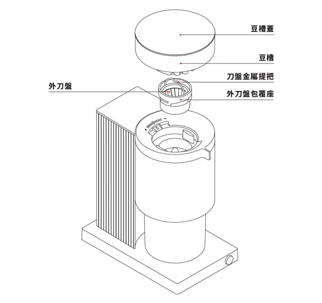 ※ 殘粉量會因研磨粗細、咖啡豆品種、烘焙程度和使用環境影響,拍打豆槽蓋能有效減少通道內部的殘粉。