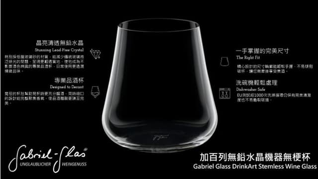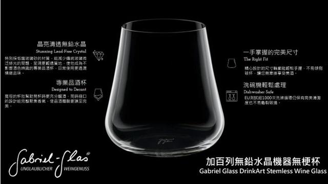 杯內95毫米的最大直徑,向上內縮的錐形杯體除了可將酒體香氣推向杯口,也可將酒體上、中、下的香氣有如在醒酒器中般自然融合。 加百列One for All水晶杯,就是以“香味導向“為理念而設計的杯款,適用於各式葡萄酒款。