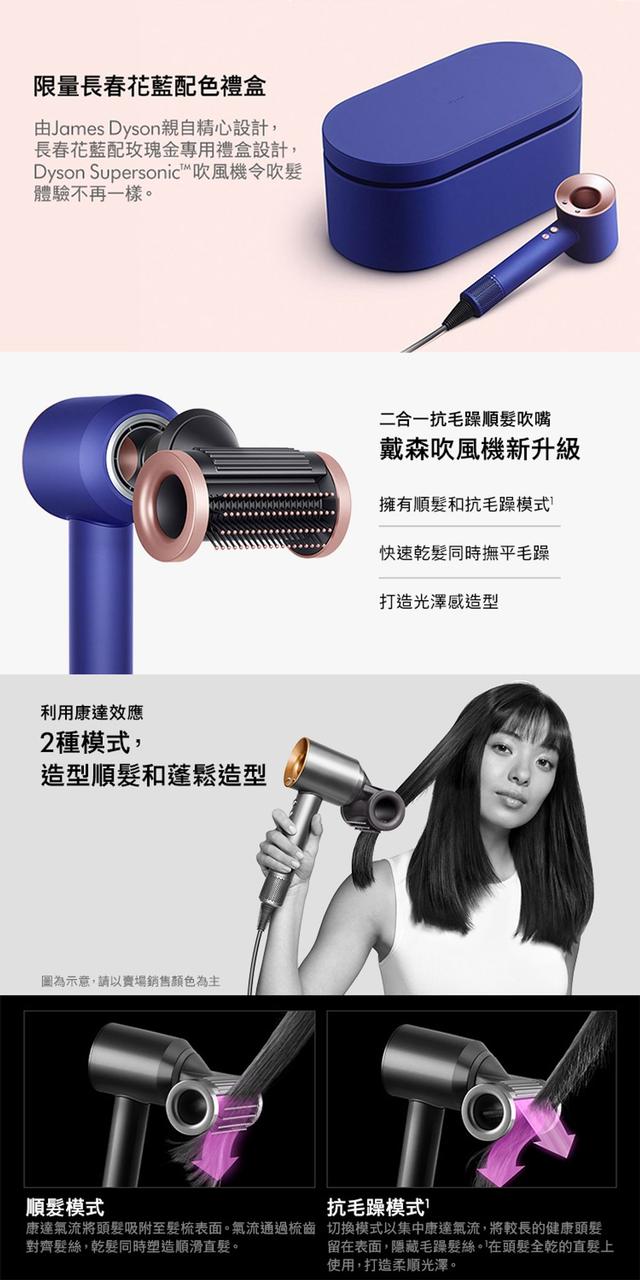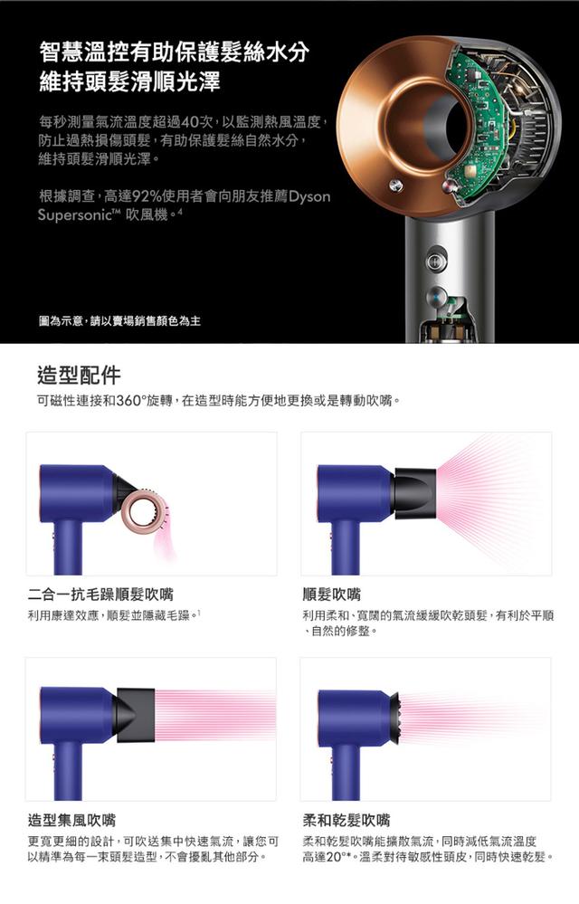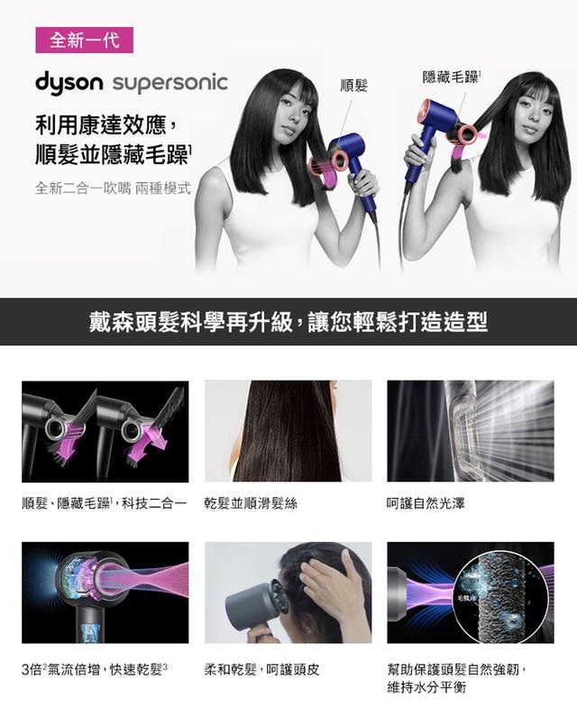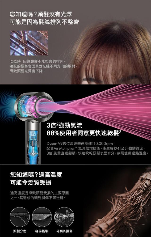 全新二合一抗毛躁順髮吹嘴 兩種模式利用康達效應 順髮並隱藏毛躁快速乾髮 免受高溫損傷專為頭髮及頭皮修護設計Dyson V9 數位馬達智慧溫控科技、保護頭髮自然光澤Air Multiplier™氣流倍增技術、快速乾髮靜音設計頭髮科學多元磁性配件濾網設計
