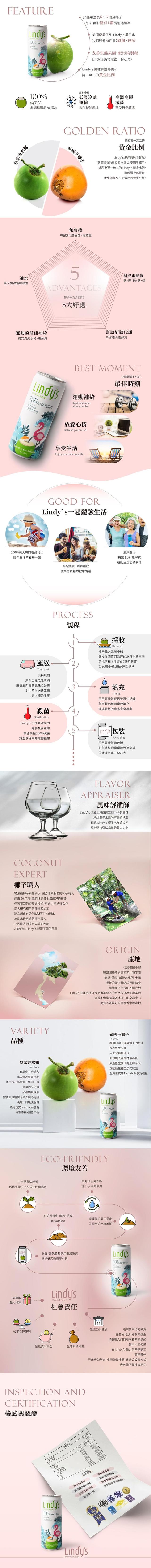 容量包裝:310ml規格:24入 / 箱.100%純天然,非濃縮還原,0添加.只選用生長6-7個月椰子,每30顆中僅有1顆能通過標準.從頂級椰子到 LINDY‘S椰子水,我們只做兩件事:殺菌、包裝