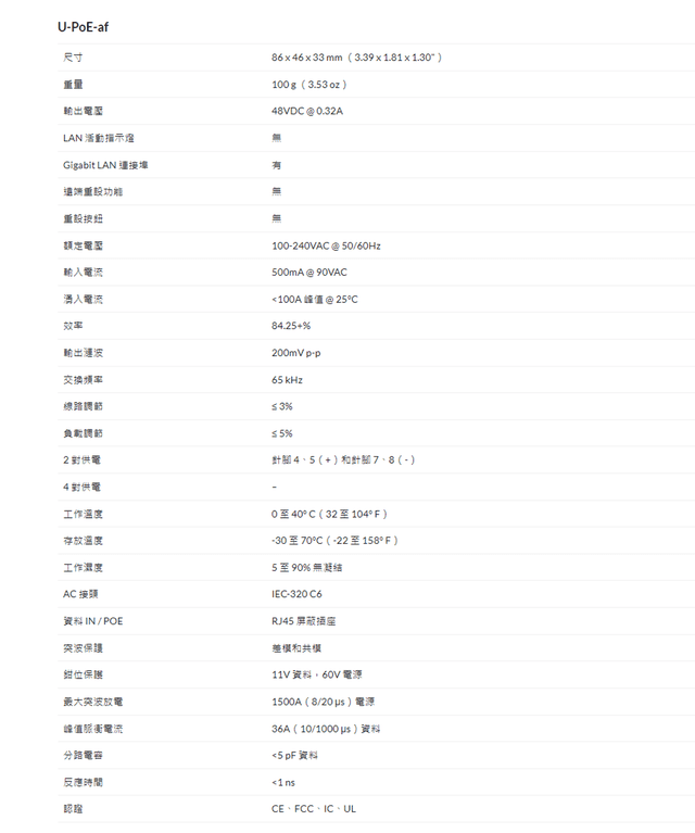 提供高達 15W 的 PoE 電源供應相容於 U6 Mesh、Camera G4 Pro 和其他 PoE 設備浪湧、峰值脈沖和過載保護帶接地功能的交流電源線可查看狀態的 LED 指示燈