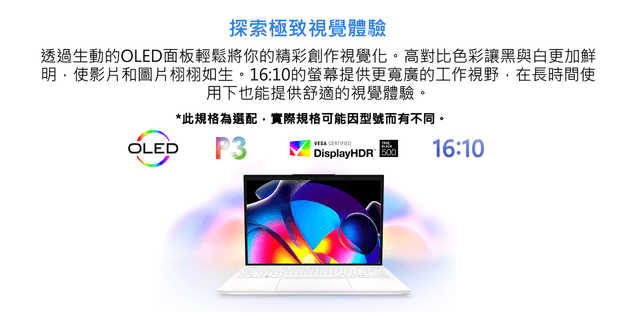 13.3吋 2.8K (2880 x 1800), 16:10黃金比例, 100% DCI-P3色域範圍, OLED面板