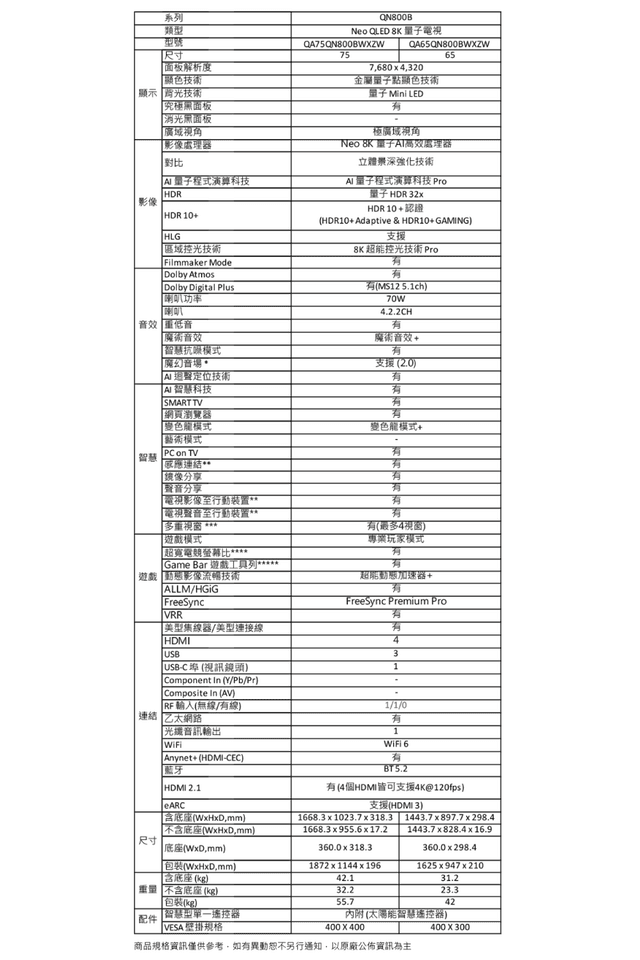 | 其他功能 | 智慧聯網功能, 支援HDR, FreeSync |