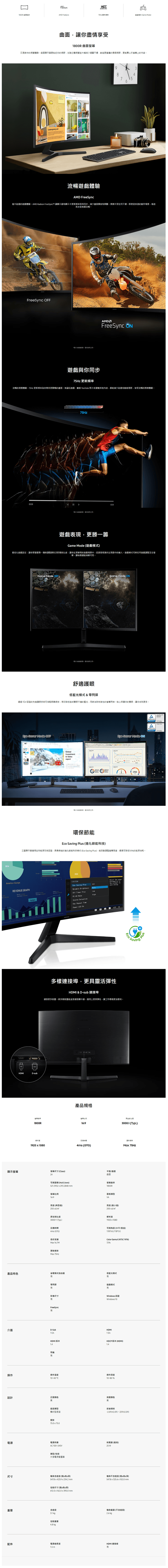 | 特殊功能 | 曲面, 低藍光, 零閃屏, 有壁掛洞 |