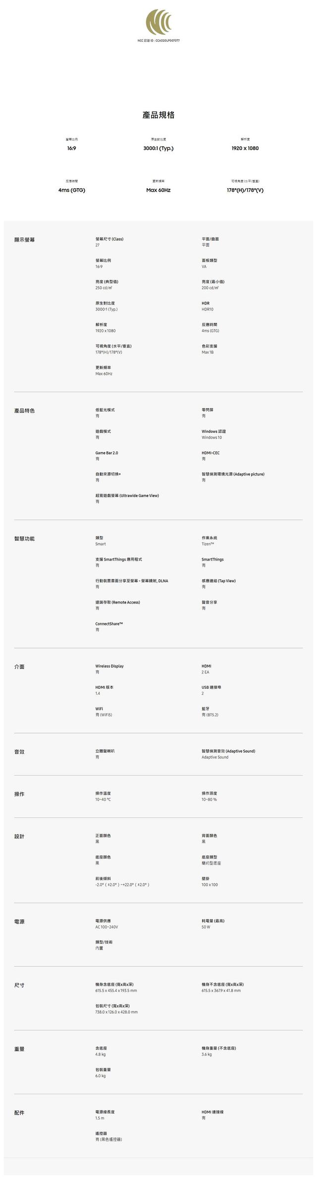 | 特殊功能 | 低藍光, 零閃屏, 內建喇叭, 有壁掛洞 |