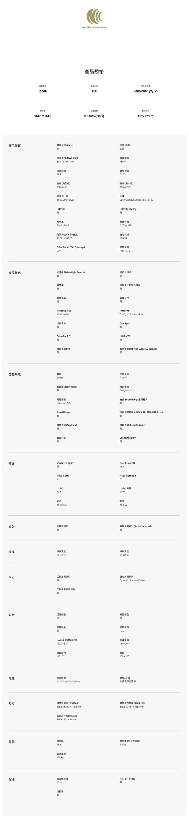 SAMSUNG 三星 Odyssey G8 34型 OLED 曲面電競螢幕(S34BG850SC)