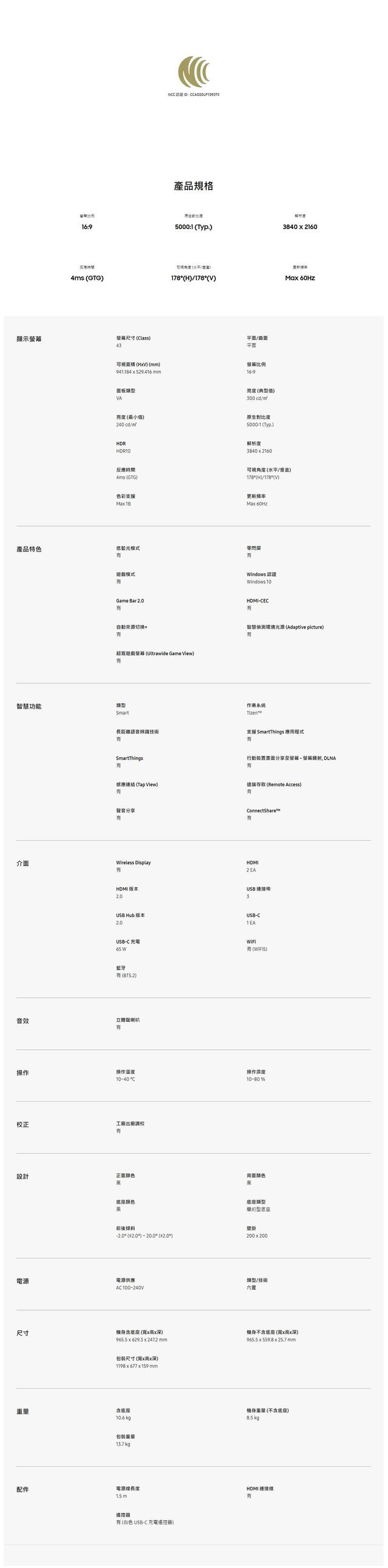 | 螢幕尺寸 | 43吋 |