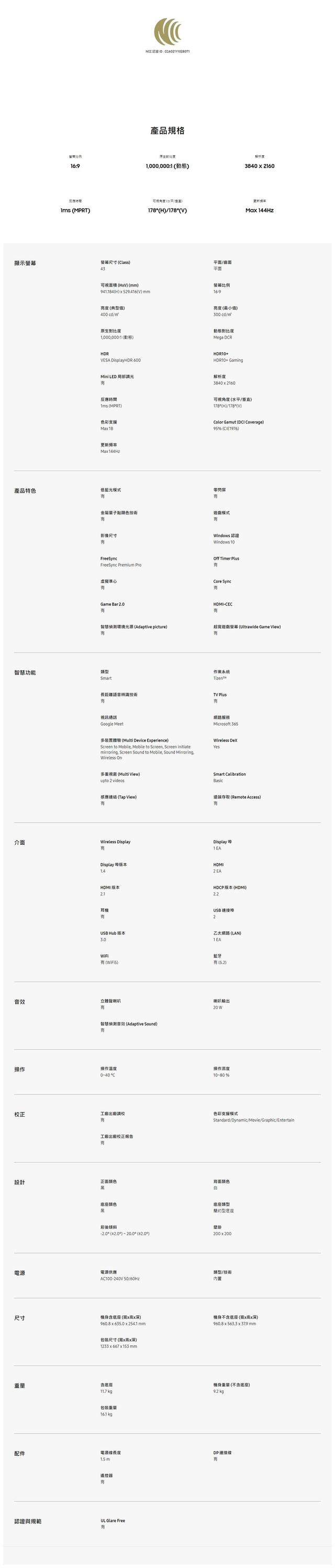 | 螢幕尺寸 | 43吋 |