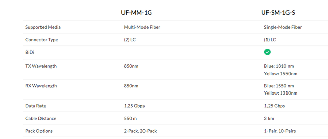 就超過乙太網路佈線 100 公尺限制的便利型多模連接而言,請使用 UF‑MM‑10G(距離長達 300 m,速度高達 10 Gbps),或使用 UF‑MM‑1G(距離長達 550 m,速度高達 1 Gbps)。