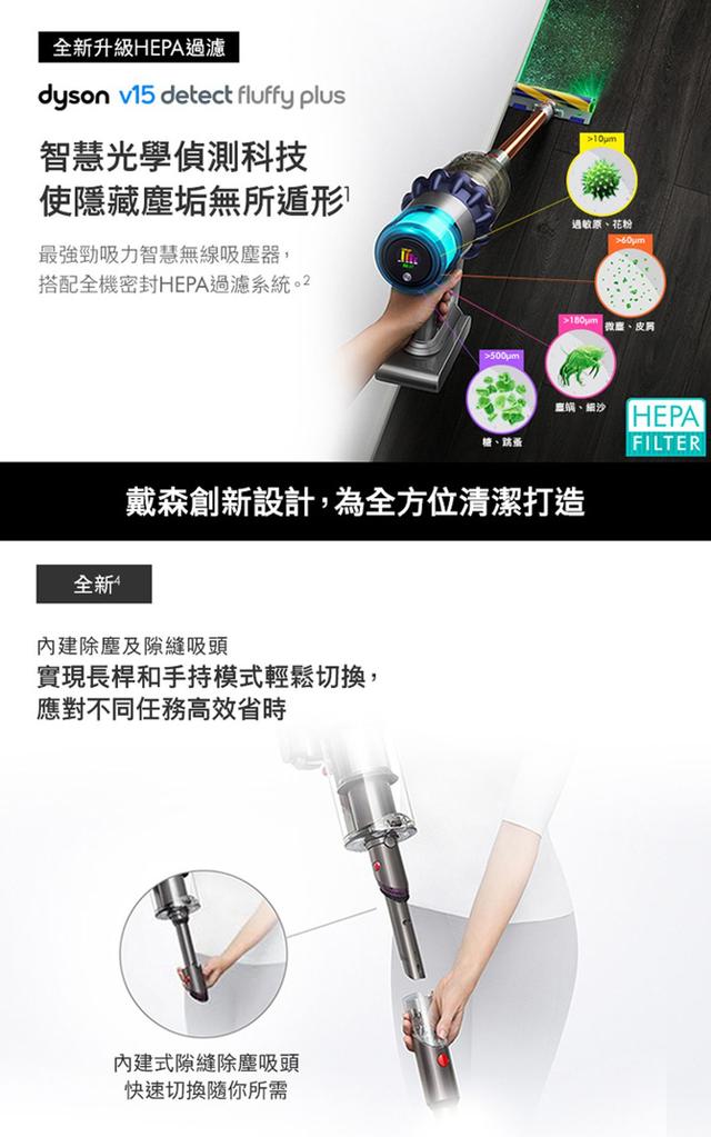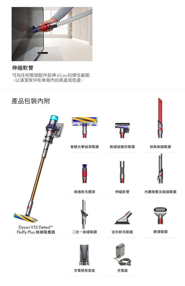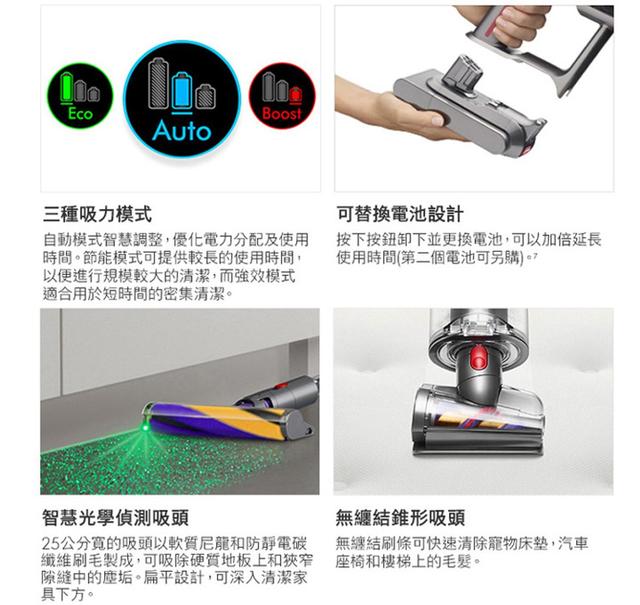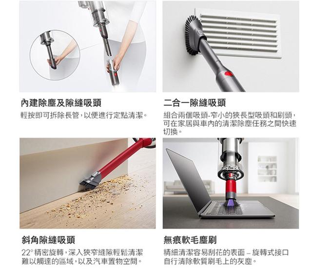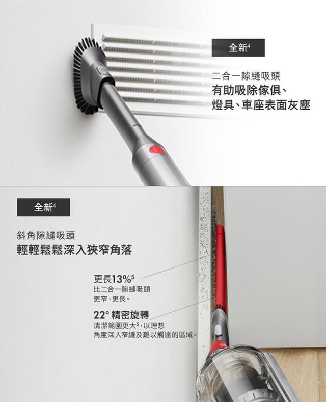 智慧光學偵測技術:清楚看清微塵,徹底清潔。全新配件升級 同時內建隙縫吸頭無纏結錐形吸頭:無纏結科技的錐型吸頭可吸除長髮和寵物毛髮無痕軟毛塵刷:全新無痕軟毛塵刷配有毛刷清潔工具,清潔精緻物品表面也能手動清潔刷毛斜角縫隙吸頭:斜角隙縫吸頭可右旋22度,清潔門縫與傢俱邊緣更順手