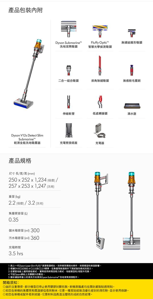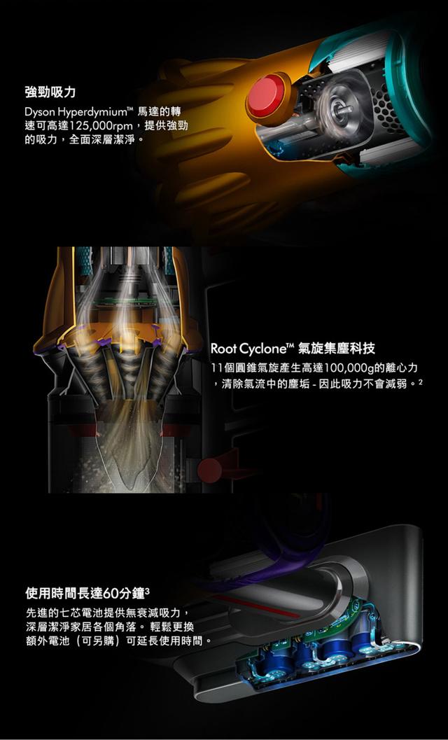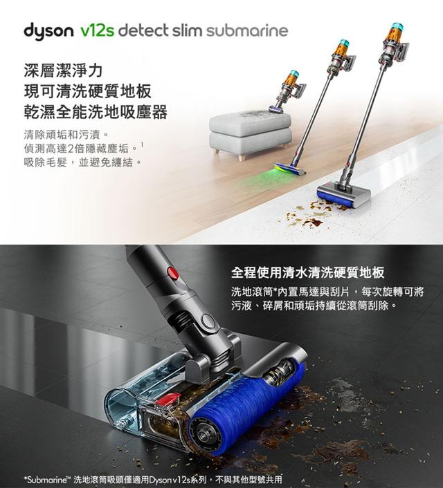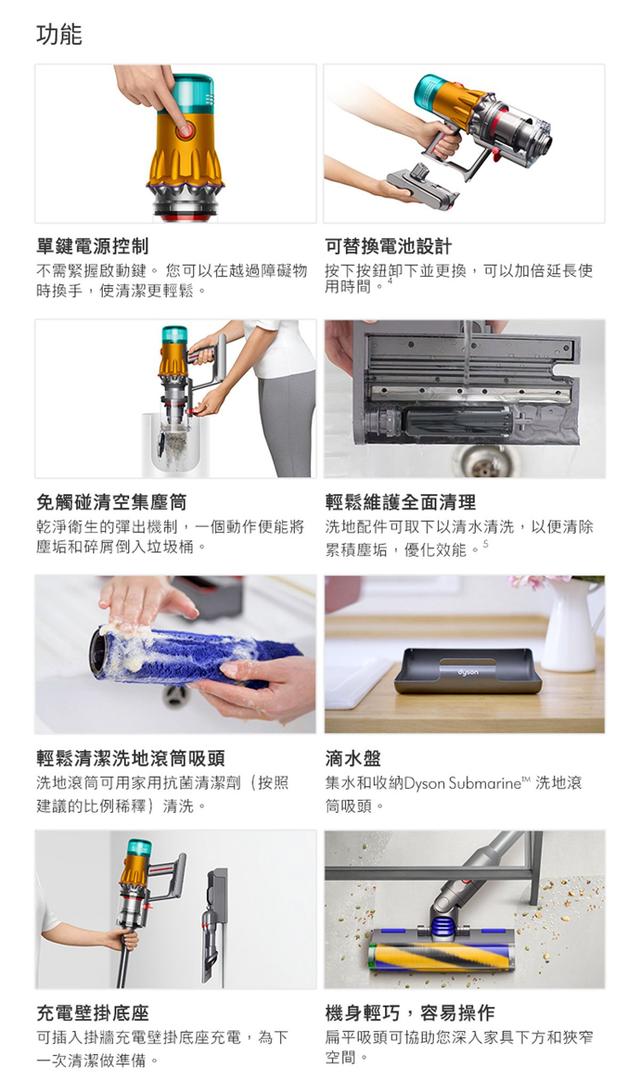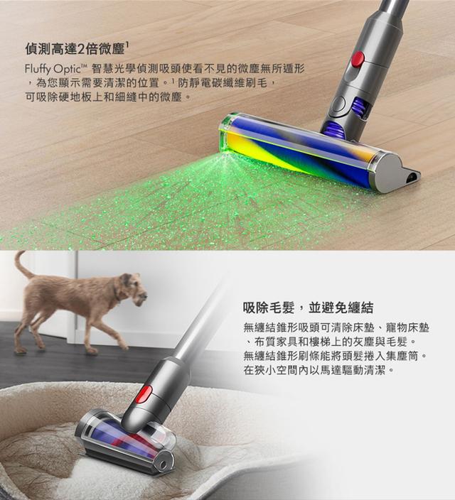 SubmarineTM洗地滾筒吸頭Fluffy OpticTM智慧光學偵測技術壓電式聲敏感測器除塵效果數顯戴森Hyperdymium數位馬達升級HEPA過濾系統全新升級配件全新無纏結錐型吸頭固定式按鍵與可替換電池