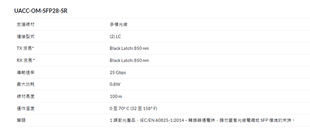 商品特色 短距離、兼容於 SFP28 的光纖收發模組。 25 Gbps 多模光纖模組是一款光纖收發器,能夠透過光纖連接維持 25 Gbps 的傳輸速度。將模組連接到兼容的光纖網路線後,只需將其插入任何 SFP28 端口即可體驗真正的 25 Gbps 速度。