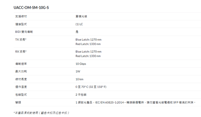 10 Gbps 吞吐量單工 LC 連接器支持長達 10 公里的連接支援線材:單模光纖(不含光纖電纜)