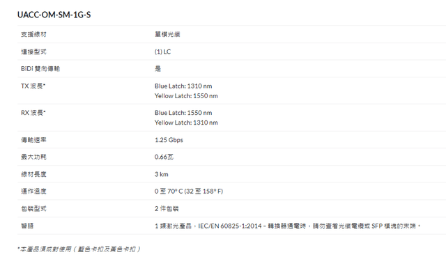 1.25 Gbps 吞吐量單工 LC 連接器支援長達 3 公里的連接支援線材:單模光纖(不含光纖電纜)