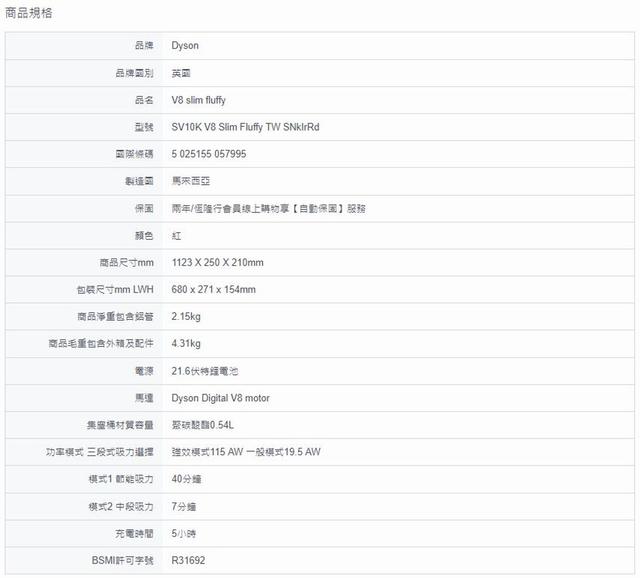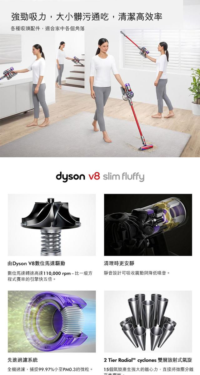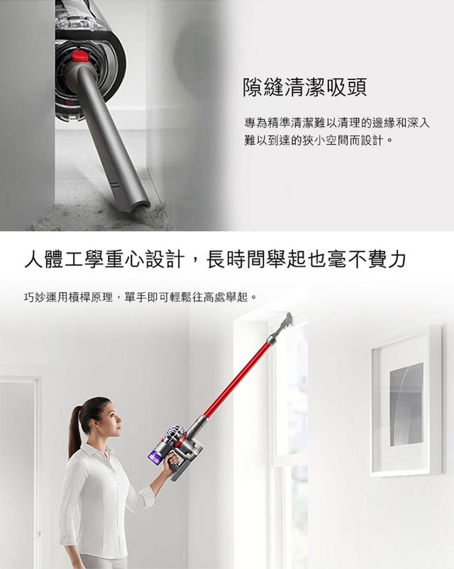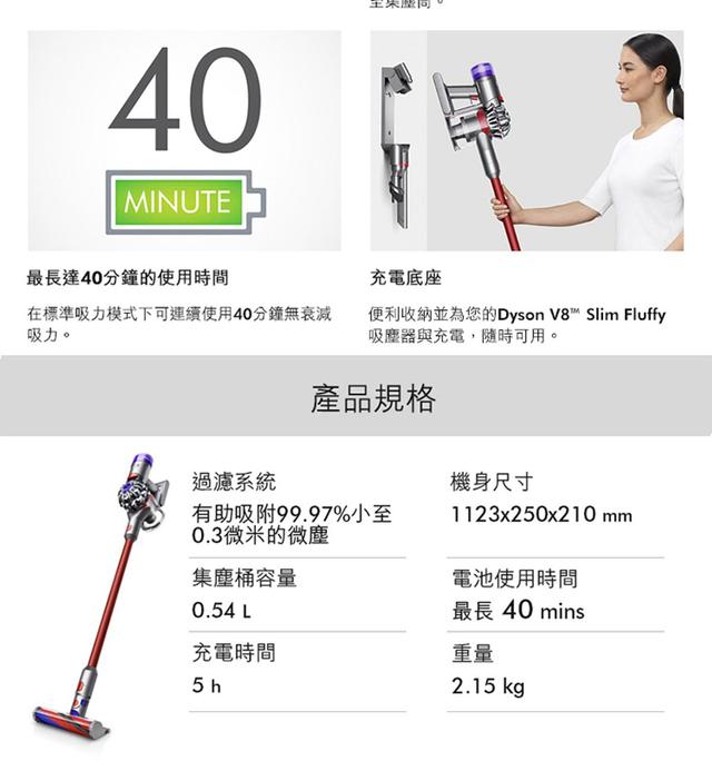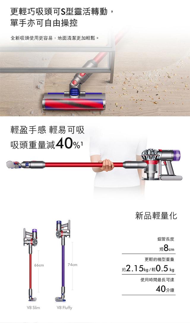 專為亞洲家庭設計,鋁管縮短9%,Fluffy吸頭重量減輕40%,整體較第一代V8輕巧但吸力不減。標準吸力模式下使用可達40分鐘。快速充電 5小時。